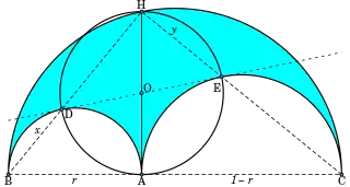 Proof: For the proof, reflect the arbelos over the line through the points B and C, and observe that twice the area of the arbelos is what remains when the areas of the two smaller circles (with diameters BA, AC) are subtracted from the area of the large circle (with diameter BC). Since the area of a circle is proportional to the square of the diameter (Euclid's Elements, Book XII, Proposition 2; we do not need to know that the constant of proportionality is π/4), the problem reduces to showing that . The length |BC| equals the sum of the lengths |BA| and |AC|, so this equation simplifies algebraically to the statement that . Thus the claim is that the length of the segment AH is the geometric mean of the lengths of the segments BA and AC. Now (see Figure) the triangle BHC, being inscribed in the semicircle, has a right angle at the point H (Euclid, Book III, Proposition 31), and consequently |HA| is indeed a "mean proportional" between |BA| and |AC| (Euclid, Book VI, Proposition 8, Porism). This proof approximates the ancient Greek argument; Harold P. Boas cites a paper of Roger B. Nelsen[3] who implemented the idea as the following proof without words.[4]