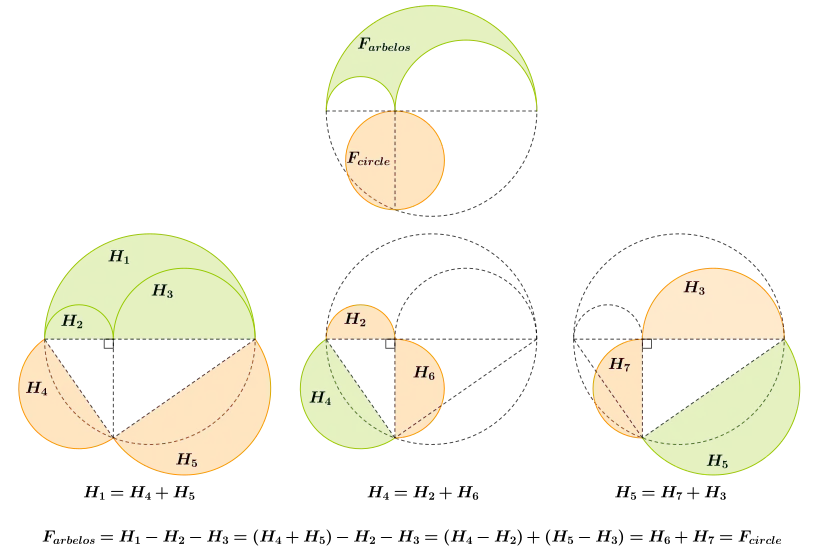 - Thomas Little Heath (1897), The Works of Archimedes. Cambridge University Press. Proposition 4 in the Book of Lemmas. Quote: If AB be the diameter of a semicircle and N any point on AB, and if semicircles be described within the first semicircle and having AN, BN as diameters respectively, the figure included between the circumferences of the three semicircles is "what Archimedes called arbelos"; and its area is equal to the circle on PN as diameter, where PN is perpendicular to AB and meets the original semicircle in P. ("Arbelos - the Shoemaker's Knife")
