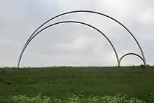 In geometry, an arbelos is a plane region bounded by three semicircles with three apexes such that each corner of each semicircle is shared with one of the others (connected), all on the same side of a straight line (the baseline) that contains their diameters.[1]