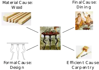 - Material cause describes the material out of which something is composed. Thus the material cause of a table is wood. It is not about action. It does not mean that one domino knocks over another domino.[48]