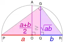 PR is the diameter of a circle centered on O; its radius AO is the arithmetic mean of a and b. Using the geometric mean theorem, triangle PGR's altitude GQ is the geometric mean. For any ratio a:b, AO ≥ GQ.