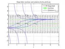 legend('Slope field', 'Isoclines', 'Solutions y_{1..6}');