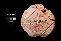 - David Gilman Romano, Athletics and Mathematics in Archaic Corinth: The Origins of the Greek Stadion, American Philosophical Society, 1993, p. 78. "A group of mathematical clay tablets from the Old Babylonian Period, excavated at Susa in 1936, and published by E.M. Bruins in 1950, provide the information that the Babylonian approximation of 3+1⁄8 or 3.125." E. M. Bruins, Quelques textes mathématiques de la Mission de Suse, 1950. E. M. Bruins and M. Rutten, Textes mathématiques de Suse, Mémoires de la Mission archéologique en Iran vol. XXXIV (1961). See also Beckmann, Petr (1971). A History of Pi. New York: St. Martin's Press. pp. 12, 21–22. "in 1936, a tablet was excavated some 200 miles from Babylon. [...] The mentioned tablet, whose translation was partially published only in 1950, [...] states that the ratio of the perimeter of a regular hexagon to the circumference of the circumscribed circle equals a number which in modern notation is given by 57/60 + 36/(60)2 [i.e. π = 3/0.96 = 25/8]". Jason Dyer, On the Ancient Babylonian Value for Pi, 3 December 2008.