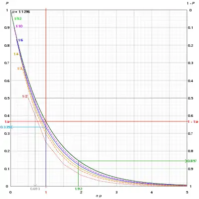 Grey curve: To get 50-50 chance of throwing a Yahtzee (5 cubic dice all showing the same number) requires 0.69 × 1296 ~ 898 throws.