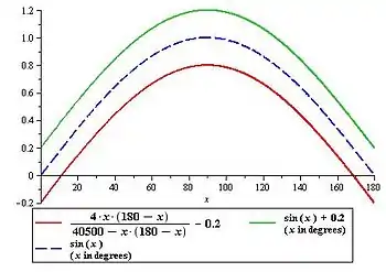 The part of the graph of sin x in the range from 0° to 180° "looks like" part of a parabola through the points (0, 0) and (180, 0). The general form of such a parabola is