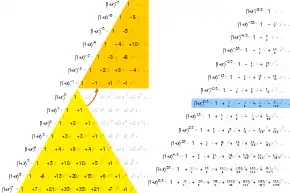 | The first few binomial coefficients on a left-aligned Pascal's triangle | ||||||