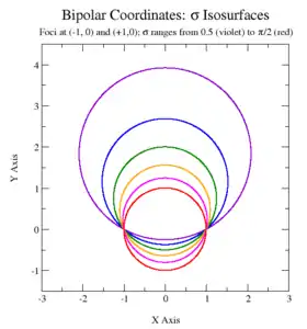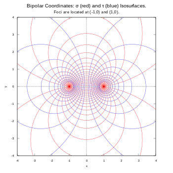 Bipolar coordinates are a two-dimensional orthogonal coordinate system based on the Apollonian circles.[1] Confusingly, the same term is also sometimes used for two-center bipolar coordinates. There is also a third system, based on two poles (biangular coordinates).