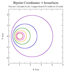 that surround the foci but again are not concentric. The centers of the constant-τ circles lie on the x-axis at with radius . The circles of positive τ lie in the right-hand side of the plane (x > 0), whereas the circles of negative τ lie in the left-hand side of the plane (x < 0). The τ = 0 curve corresponds to the y-axis (x = 0). As the magnitude of τ increases, the radius of the circles decreases and their centers approach the foci.