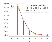 The ordinary bootstrap requires the random selection of n elements from a list, which is equivalent to drawing from a binomial distribution. This may require a large number of passes over the data and is challenging to run these computations in parallel. For large values of n, the Poisson bootstrap is an efficient method of generating bootstrapped data sets.[40] When generating a single bootstrap sample, instead of randomly drawing from the sample data with replacement, each data point is assigned a random weight distributed according to the Poisson distribution with . For large sample data, this will approximate random sampling with replacement. This is due to the following approximation: