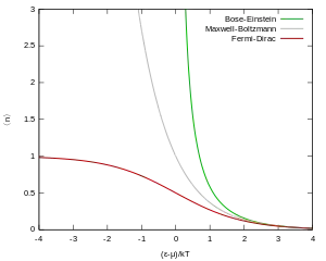 - In the limit of low particle density, , therefore or equivalently . In that case, , which is the result from Maxwell–Boltzmann statistics.