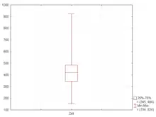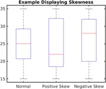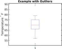 In descriptive statistics, a box plot or boxplot is a method for demonstrating graphically the locality, spread and skewness groups of numerical data through their quartiles.[1] In addition to the box on a box plot, there can be lines (which are called whiskers) extending from the box indicating variability outside the upper and lower quartiles, thus, the plot is also called the box-and-whisker plot and the box-and-whisker diagram. Outliers that differ significantly from the rest of the dataset[2] may be plotted as individual points beyond the whiskers on the box-plot. Box plots are non-parametric: they display variation in samples of a statistical population without making any assumptions of the underlying statistical distribution[3] (though Tukey's boxplot assumes symmetry for the whiskers and normality for their length). The spacings in each subsection of the box-plot indicate the degree of dispersion (spread) and skewness of the data, which are usually described using the five-number summary. In addition, the box-plot allows one to visually estimate various L-estimators, notably the interquartile range, midhinge, range, mid-range, and trimean. Box plots can be drawn either horizontally or vertically.