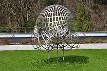 The Mathematical Research Institute of Oberwolfach has a large model of a Boy's surface outside the entrance, constructed and donated by Mercedes-Benz in January 1991. This model has 3-fold rotational symmetry and minimizes the Willmore energy of the surface. It consists of steel strips which represent the image of a polar coordinate grid under a parameterization given by Robert Bryant and Rob Kusner. The meridians (rays) become ordinary Möbius strips, i.e. twisted by 180 degrees. All but one of the strips corresponding to circles of latitude (radial circles around the origin) are untwisted, while the one corresponding to the boundary of the unit circle is a Möbius strip twisted by three times 180 degrees — as is the emblem of the institute (Mathematisches Forschungsinstitut Oberwolfach 2011).