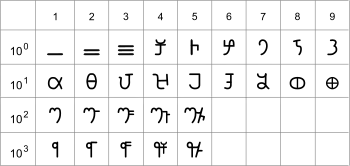 | Hindu–Arabic numerals | 1 | 2 | 3 | 4 | 5 | 6 | 7 | 8 | 9 | 10 | 20 | 30 | 40 | 50 | 60 | 70 | 80 | 90 | 100 | 1000 |
