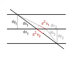 where the last part is the displacement for given change in time for 2nd differentials. Now consider the changes along the two neighboring paths in the figure below for which the horizontal separation between paths along the central line is d2x (the same for both the upper and lower differential triangles). Along the old and new paths, the parts that differ are,