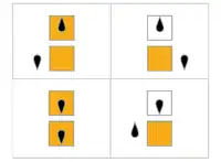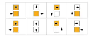 In the following table, the rules for each busy beaver (maximizing Σ) are represented visually, with orange squares corresponding to a "1" on the tape, and white corresponding to "0". The position of the head is indicated by the black ovoid, with the orientation of the head representing the state. Individual tapes are laid out horizontally, with time progressing from top to bottom. The halt state is represented by a rule which maps one state to itself (head doesn't move).