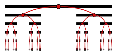 In arithmetical terms, the Cantor set consists of all real numbers of the unit interval that do not require the digit 1 in order to be expressed as a ternary (base 3) fraction. As the above diagram illustrates, each point in the Cantor set is uniquely located by a path through an infinitely deep binary tree, where the path turns left or right at each level according to which side of a deleted segment the point lies on. Representing each left turn with 0 and each right turn with 2 yields the ternary fraction for a point.