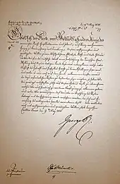 Gauss' life was overshadowed by severe problems in his family. When his first wife Johanna suddenly died shortly after the birth of their third child, he revealed the grief in a last letter to his dead wife in the style of an ancient threnody, the most personal surviving document of Gauss.[88][89] The situation worsened when tuberculosis afflicted and ultimately destroyed the health of his second wife Minna over 13 years; both his daughters later suffered from the same disease.[90] Both younger sons were educated for some years in Celle far from Göttingen. Gauss himself gave only slight hints of his distress: in a letter to Bessel dated December 1831 he described himself as "the victim of the worst domestic sufferings".[55]