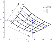 A carpet plot with two independent variables and one dependent variable is often called a cheater plot for the use of a phantom "cheater" axis instead of the horizontal axis. As a result of this missing axis, the values can be shifted horizontally such that the intersections line up vertically. This allows easy interpolation by having fixed horizontal intervals correspond to fixed intervals in both independent variables. The horizontal shift must sometimes be adjusted in order to eliminate or mitigate overlapping.[4] Depending on the data being depicted, eliminating overlapping is not always possible. The common solution is to split the plot into two carpets.