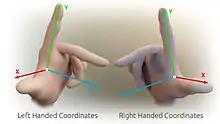Once the x- and y-axes are specified, they determine the line along which the z-axis should lie, but there are two possible orientations for this line. The two possible coordinate systems, which result are called 'right-handed' and 'left-handed'.[12] The standard orientation, where the xy-plane is horizontal and the z-axis points up (and the x- and the y-axis form a positively oriented two-dimensional coordinate system in the xy-plane if observed from above the xy-plane) is called right-handed or positive.