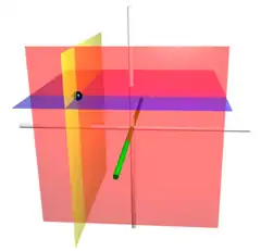A Cartesian coordinate system for a three-dimensional space consists of an ordered triplet of lines (the axes) that go through a common point (the origin), and are pair-wise perpendicular; an orientation for each axis; and a single unit of length for all three axes. As in the two-dimensional case, each axis becomes a number line. For any point P of space, one considers a hyperplane through P perpendicular to each coordinate axis, and interprets the point where that hyperplane cuts the axis as a number. The Cartesian coordinates of P are those three numbers, in the chosen order. The reverse construction determines the point P given its three coordinates.
