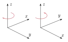 Figure 7 depicts a left and a right-handed coordinate system. Because a three-dimensional object is represented on the two-dimensional screen, distortion and ambiguity result. The axis pointing downward (and to the right) is also meant to point towards the observer, whereas the "middle"-axis is meant to point away from the observer. The red circle is parallel to the horizontal xy-plane and indicates rotation from the x-axis to the y-axis (in both cases). Hence the red arrow passes in front of the z-axis.