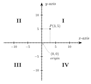 A Cartesian coordinate system in two dimensions (also called a rectangular coordinate system or an orthogonal coordinate system[8]) is defined by an ordered pair of perpendicular lines (axes), a single unit of length for both axes, and an orientation for each axis. The point where the axes meet is taken as the origin for both, thus turning each axis into a number line. For any point P, a line is drawn through P perpendicular to each axis, and the position where it meets the axis is interpreted as a number. The two numbers, in that chosen order, are the Cartesian coordinates of P. The reverse construction allows one to determine the point P given its coordinates.