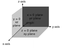 For 3D diagrams, the names "abscissa" and "ordinate" are rarely used for x and y, respectively. When they are, the z-coordinate is sometimes called the applicate. The words abscissa, ordinate and applicate are sometimes used to refer to coordinate axes rather than the coordinate values.[8]