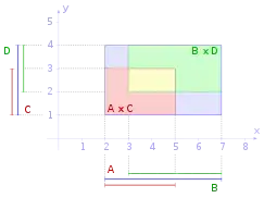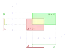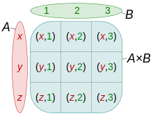 In mathematics, specifically set theory, the Cartesian product of two sets A and B, denoted A × B, is the set of all ordered pairs (a, b) where a is in A and b is in B.[1] In terms of set-builder notation, that is