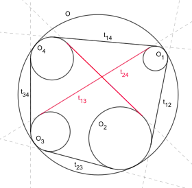 Let be a circle of radius . Let be (in that order) four non-intersecting circles that lie inside and tangent to it. Denote by the length of the exterior common bitangent of the circles . Then:[1]