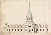 St Paul's Cathedral in London has always been the highlight of Wren's reputation. His association with it spans his whole architectural career, including the 36 years between the start of the new building and the declaration by parliament of its completion in 1711.Letters document Wren's involvement in St Paul as early as 1661, when he was consulted by Charles II regarding repairs to the medieval structure.[16] In the spring of 1666, he made his first design for a dome for St Paul's. It was accepted in principle on 27 August 1666. One week later, however, the Great Fire of London reduced two-thirds of the City to a smoking desert and old St Paul's to ruin. Wren was most likely at Oxford at the time, but the news, so fantastically relevant to his future, drew him at once to London. Between 5 and 11 September, he ascertained the precise area of devastation, worked out a plan for rebuilding the City and submitted it to Charles II. Others also submitted plans. However, no new plan proceeded any further than the paper on which it was drawn. A Rebuilding of London Act which provided rebuilding of some essential buildings was passed in 1666. In 1669, the King's Surveyor of Works died and Wren was promptly installed.
