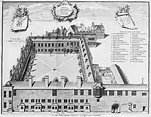 After receiving his M.A. in 1653, Wren was elected a fellow of All Souls' College in the same year and began an active period of research and experiment in Oxford.[13] Among these were a number of physiological experiments on dogs, including one now recognized as the first injection of fluids into the bloodstream of a live animal under laboratory conditions. At Oxford he became part of the group around John Wilkins, he was key to the correspondence network known as the Invisible College,[14] Within the arms of All Souls, the arms of Wren's friend Robert Boyle appear in the colonnade of the Great Quadrangle, opposite the arms of the Hill family of Shropshire, close by a sundial designed by Boyle's friend Wren.[15]