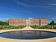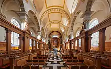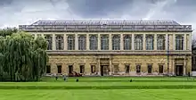 Wren's second, similarly collegiate work followed soon after, when he was commissioned to design Oxford's "New Theatre", financed by Gilbert Sheldon.[46] His design for the structure was met with lukewarm to negative reception, with even Wren's defenders admitting the young architect to have not yet been "capable of handling a large architectural composition with assurance".[16] Adrian Tinniswood credits the building's flaws to "Sheldon's refusal to pay for an elaborate exterior, Wren's inability to find an adequate external expression for a building which was wholly conditioned by the functionality of its interior space and, ...his refusal to bend the knee to classical authority in the way that our experience of eighteenth-century architecture has conditioned us to believe is right."[16] Prior to the theatre's 1669 completion, Wren had received further commissions for the Garden Quadrangle at Trinity College, Oxford, and the chapel of Emmanuel College, Cambridge.[16]