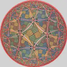 In a 1958 letter from Escher to H. S. M. Coxeter, Escher wrote that he was inspired to make his Circle Limit series by a figure in Coxeter's article "Crystal Symmetry and its Generalizations".[2][3] Coxeter's figure depicts a tessellation of the hyperbolic plane by right triangles with angles of 30°, 45°, and 90°; triangles with these angles are possible in hyperbolic geometry but not in Euclidean geometry. This tessellation may be interpreted as depicting the lines of reflection and fundamental domains of the (6,4,2) triangle group.[5] An elementary analysis of Coxeter's figure, as Escher might have understood it, is given by Casselman (2010).[6]