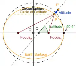 Normally the circles of latitude are defined at zero elevation. Elevation has an effect on a location with respect to the plane formed by a circle of latitude. Since (in the geodetic system) altitude and depth are determined by the normal to the Earth's surface, locations sharing the same latitudebut having different elevations (i.e., lying along this normal)no longer lie within this plane. Rather, all points sharing the same latitudebut of varying elevation and longitudeoccupy the surface of a truncated cone formed by the rotation of this normal around the Earth's axis of rotation.