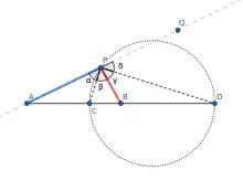 Also take some other point anywhere on the extended line . Again by the converse of the angle bisector theorem, the line bisects the exterior angle . Hence, and are equal and . Hence by Thales's theorem lies on the circle which has as a diameter.