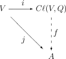 (where 1A denotes the multiplicative identity of A), there is a unique algebra homomorphism f : Cl(V, Q) → A such that the following diagram commutes (i.e. such that f ∘ i = j):