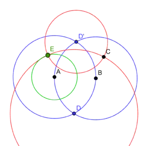 - Draw circles through C with centers at D and D' (the red circles). Label their other intersection E.