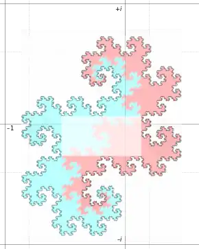 The rounding region of an integer – i.e., a set of complex (non-integer) numbers that share the integer part of their representation in this system – has in the complex plane a fractal shape: the twindragon (see figure). This set is, by definition, all points that can be written as with . can be decomposed into 16 pieces congruent to . Notice that if is rotated counterclockwise by 135°, we obtain two adjacent sets congruent to , because . The rectangle in the center intersects the coordinate axes counterclockwise at the following points: , , and , and . Thus, contains all complex numbers with absolute value ≤ 1/15.[12]