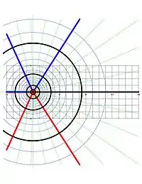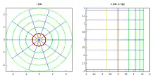 - Circles[6] in the z-plane centered at 0 are mapped to vertical segments in the w-plane connecting to , where is the real log of the radius of the circle.