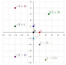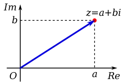 A complex number z can be identified with the ordered pair of real numbers , which may be interpreted as coordinates of a point in a Euclidean plane with standard coordinates, which is then called the complex plane or Argand diagram,[6][lower-alpha 1].[7] The horizontal axis is generally used to display the real part, with increasing values to the right, and the imaginary part marks the vertical axis, with increasing values upwards.