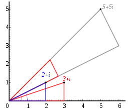 Because the real and imaginary part of 5 + 5i are equal, the argument of that number is 45 degrees, or π/4 (in radian). On the other hand, it is also the sum of the angles at the origin of the red and blue triangles are arctan(1/3) and arctan(1/2), respectively. Thus, the formula