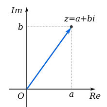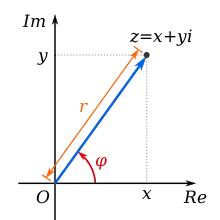 The common terms used in the theory are chiefly due to the founders. Argand called cos φ + i sin φ the direction factor, and the modulus;[lower-alpha 4][43] Cauchy (1821) called cos φ + i sin φ the reduced form (l'expression réduite)[44] and apparently introduced the term argument; Gauss used i for ,[lower-alpha 5] introduced the term complex number for a + bi,[lower-alpha 6] and called a2 + b2 the norm.[lower-alpha 7] The expression direction coefficient, often used for cos φ + i sin φ, is due to Hankel (1867),[48] and absolute value, for modulus, is due to Weierstrass.