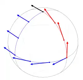 Consider the following problem. Suppose that a tangent vector to the sphere S is given at the north pole, and we are to define a manner of consistently moving this vector to other points of the sphere: a means for parallel transport. Naively, this could be done using a particular coordinate system. However, unless proper care is applied, the parallel transport defined in one system of coordinates will not agree with that of another coordinate system. A more appropriate parallel transportation system exploits the symmetry of the sphere under rotation. Given a vector at the north pole, one can transport this vector along a curve by rotating the sphere in such a way that the north pole moves along the curve without axial rolling. This latter means of parallel transport is the Levi-Civita connection on the sphere. If two different curves are given with the same initial and terminal point, and a vector v is rigidly moved along the first curve by a rotation, the resulting vector at the terminal point will be different from the vector resulting from rigidly moving v along the second curve. This phenomenon reflects the curvature of the sphere. A simple mechanical device that can be used to visualize parallel transport is the south-pointing chariot.