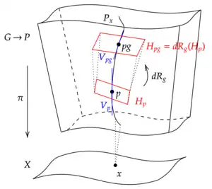 Finally, let Γ be a principal connection in this sense. Let q:TPTP/G be the quotient map. The horizontal distribution of the connection is the bundle