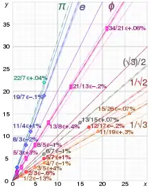 An infinite continued fraction representation for an irrational number is useful because its initial segments provide rational approximations to the number. These rational numbers are called the convergents of the continued fraction.[11][12] The larger a term is in the continued fraction, the closer the corresponding convergent is to the irrational number being approximated. Numbers like π have occasional large terms in their continued fraction, which makes them easy to approximate with rational numbers. Other numbers like e have only small terms early in their continued fraction, which makes them more difficult to approximate rationally. The golden ratio Φ has terms equal to 1 everywhere—the smallest values possible—which makes Φ the most difficult number to approximate rationally. In this sense, therefore, it is the "most irrational" of all irrational numbers. Even-numbered convergents are smaller than the original number, while odd-numbered ones are larger.