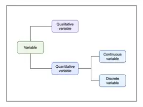 Variables can be divided into two main categories: qualitative (categorical) and quantitative (numerical). Continuous and discrete variables are subcategories of quantitative variables. Note that this schematic is not exhaustive in terms of the types of variables.