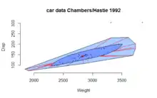 In robust statistics, the convex hull provides one of the key components of a bagplot, a method for visualizing the spread of two-dimensional sample points. The contours of Tukey depth form a nested family of convex sets, with the convex hull outermost, and the bagplot also displays another polygon from this nested family, the contour of 50% depth.[56]