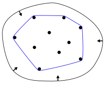 In geometry, the convex hull, convex envelope or convex closure[1] of a shape is the smallest convex set that contains it. The convex hull may be defined either as the intersection of all convex sets containing a given subset of a Euclidean space, or equivalently as the set of all convex combinations of points in the subset. For a bounded subset of the plane, the convex hull may be visualized as the shape enclosed by a rubber band stretched around the subset.