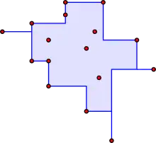 For bounded sets in the Euclidean plane, not all on one line, the boundary of the convex hull is the simple closed curve with minimum perimeter containing . One may imagine stretching a rubber band so that it surrounds the entire set and then releasing it, allowing it to contract; when it becomes taut, it encloses the convex hull of .[3] This formulation does not immediately generalize to higher dimensions: for a finite set of points in three-dimensional space, a neighborhood of a spanning tree of the points encloses them with arbitrarily small surface area, smaller than the surface area of the convex hull.[4] However, in higher dimensions, variants of the obstacle problem of finding a minimum-energy surface above a given shape can have the convex hull as their solution.[5]