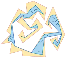 The convex hull of a simple polygon encloses the given polygon and is partitioned by it into regions, one of which is the polygon itself. The other regions, bounded by a polygonal chain of the polygon and a single convex hull edge, are called pockets. Computing the same decomposition recursively for each pocket forms a hierarchical description of a given polygon called its convex differences tree.[24] Reflecting a pocket across its convex hull edge expands the given simple polygon into a polygon with the same perimeter and larger area, and the Erdős–Nagy theorem states that this expansion process eventually terminates.[25]